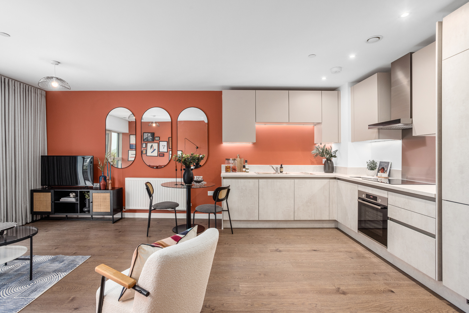 Inside the apartments, contemporary kitchens are fitted with fully integrated appliances, including an oven, hob, fridge/freezer and dishwasher. Modern bathrooms feature white sanitaryware and sleek fittings, while all homes benefit from one allocated parking space and a private balcony or terrace. Secure bicycle storage is also available, encouraging sustainable travel for shorter journeys.