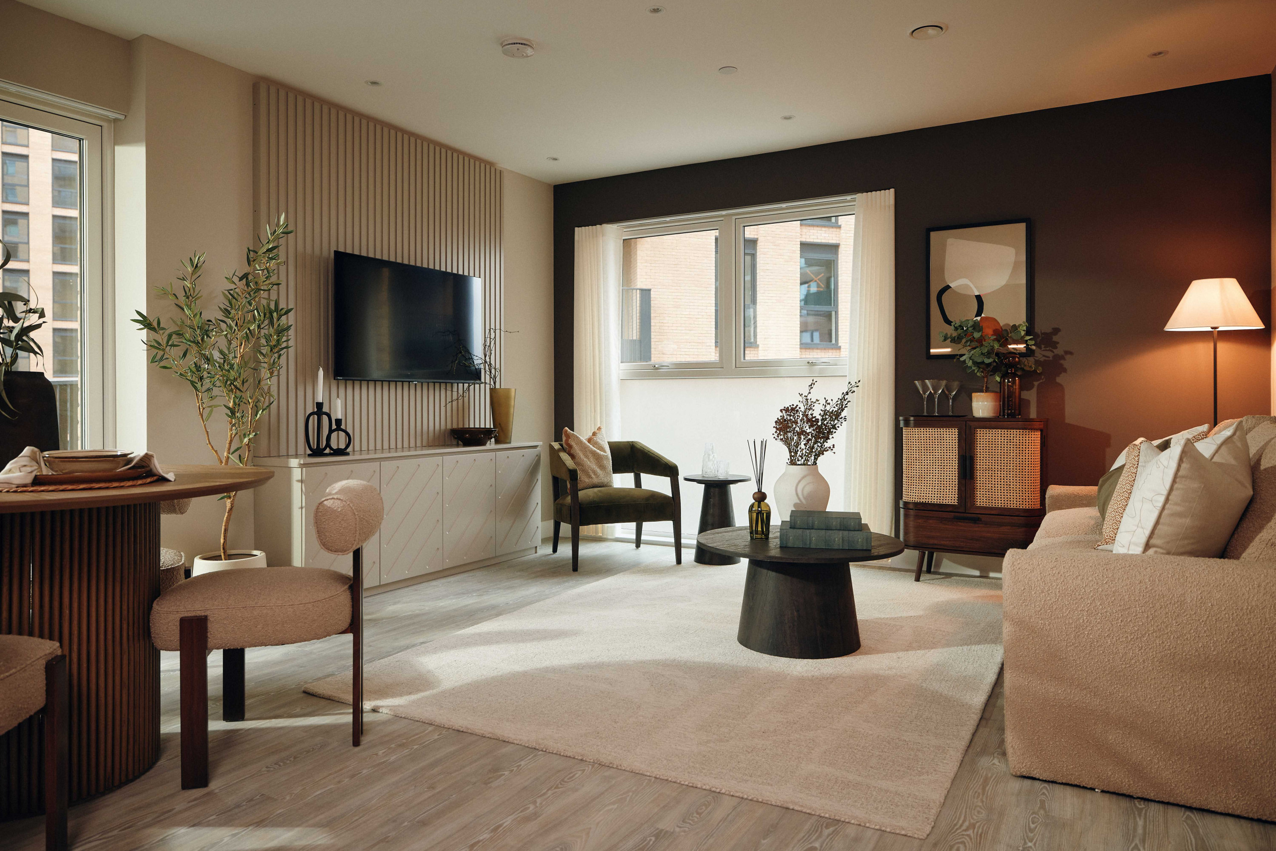 Apartments at Kew Bridge Rise combine contemporary design with thoughtful details. Open-plan living areas create a modern feel, whilst sleek fitted kitchens are fully equipped with integrated appliances. Bedrooms feature fitted wardrobes and carpeting, while large storage cupboards house washer/dryers to support everyday practicality. Each apartment also benefits from a private outdoor space with external lighting.